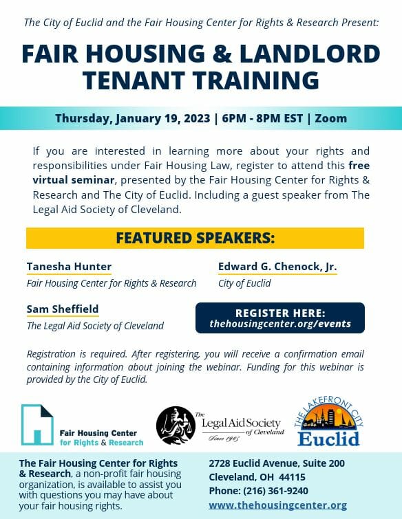 If you are interested in learning more about your rights and responsibilities under Fair Housing Law, register to attend this free virtual seminar, presented by the Fair Housing Center for Rights & Research and The City of Euclid. This online event will include a guest speaker from The Legal Aid Society of Cleveland sharing information about landlord-tenant law.